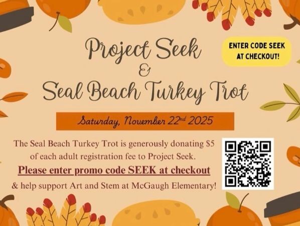 The Seal Beach Turkey Trot aims to raise over $25,000 in funds and awareness in our community every year, and they've partnered with Project SEEK to give back $5 for every adult registration. Enter promo code SEEK at checkout in order to help support our Art and STEM programs at McGaugh.